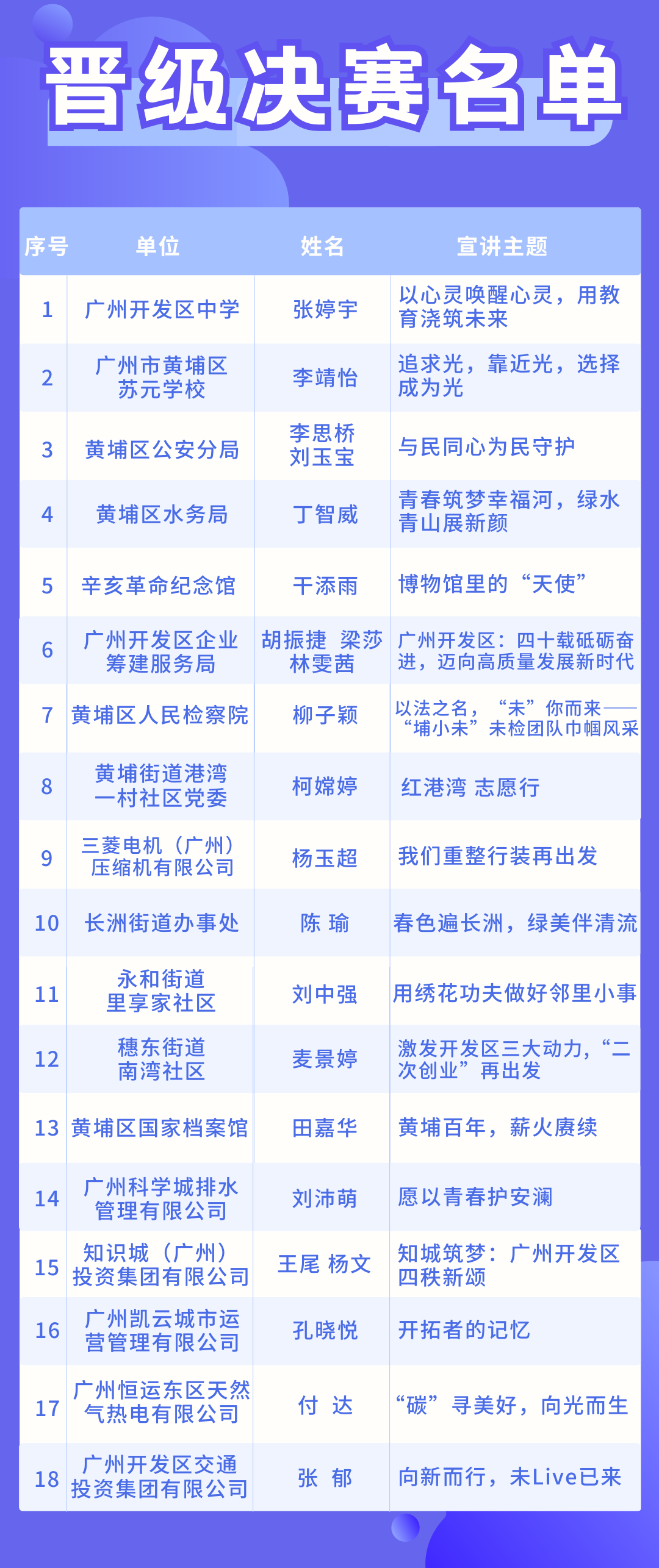 为深入学习贯彻习近平新时代中国特色社会主义思想,全面贯彻党的二十大精神,认真落实省委“1310”具体部署和市委“1312”思路举措,挖掘、选拔、培育、推荐一批政治素质过硬、表达能力突出,讲好广州故事、黄埔故事,适应新时代宣讲工作发展需要的百姓宣讲员,近日,在中共广州市委宣传部的指导下,由中共广州市黄埔区委宣传部主办的黄埔区第二届“埔公英”百姓宣讲员大赛如火如荼进行选拔、比拼中。
