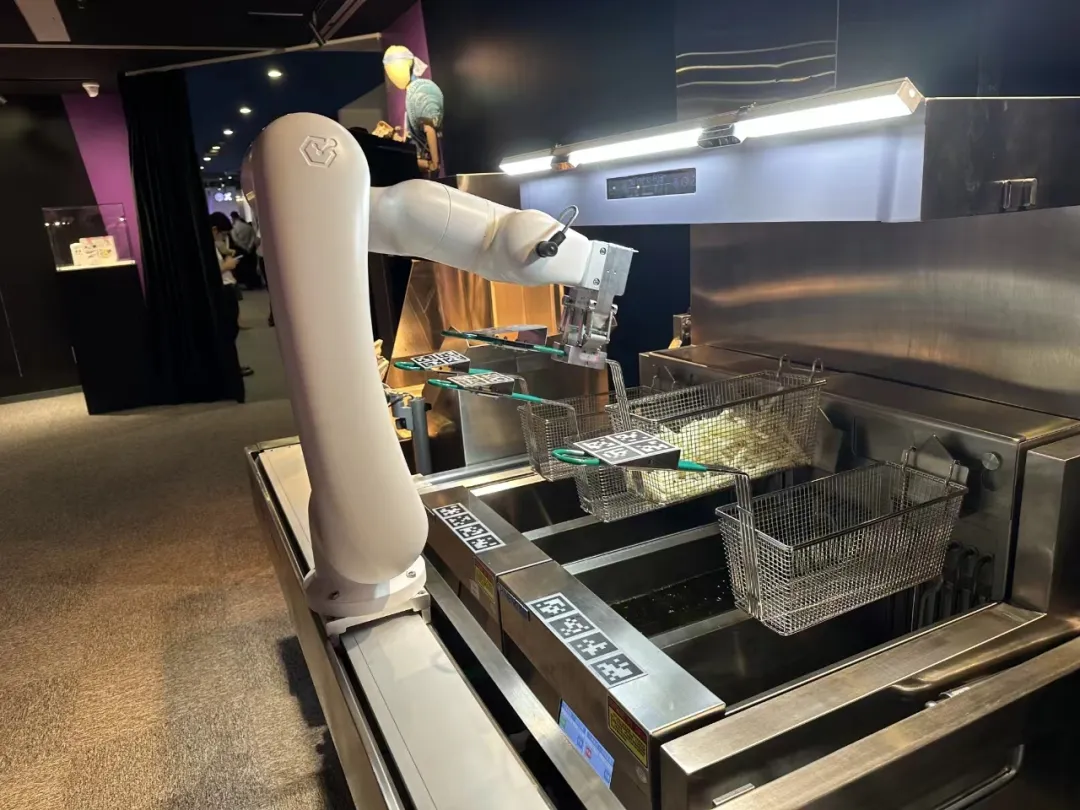 其中LAVA厨房机器人工作站有着专用轻量化机械臂,能自动从冰柜中拿出薯条、鸡块、鸡翅并放入相应的炸区进行炸制,不一会儿炸制好的薯条就被倒入餐盘中。