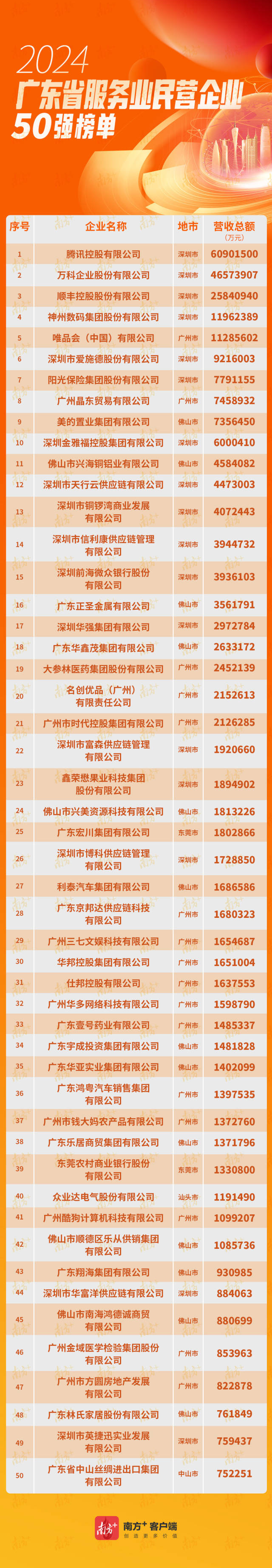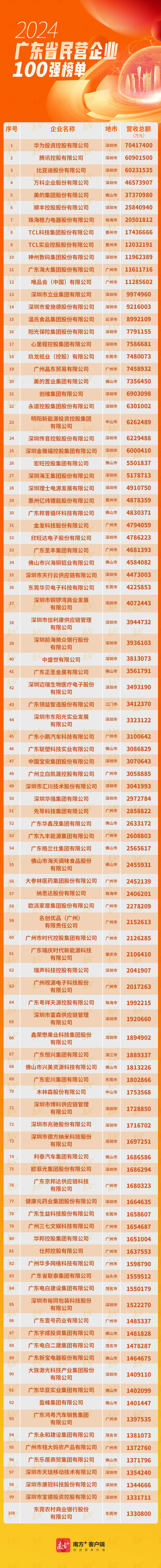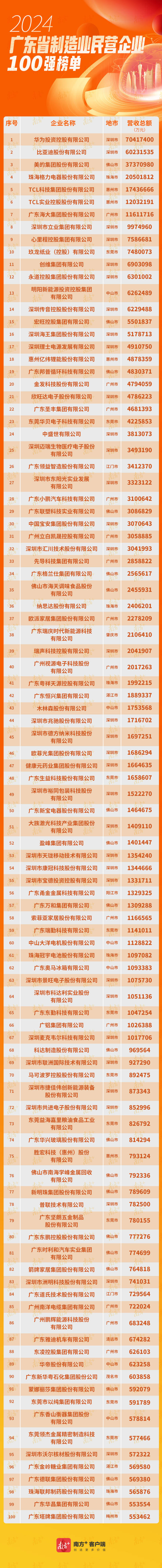 据介绍,2024年省工商联继续开展“广东省民营企业100强”调研排序工作。由企业自愿申报并以2023年企业营业收入为基本标准,以企业会计年表为依据,经有关部门审核排序,产生了“2024广东省民营企业100强”“2024广东省制造业民营企业100强”“2024广东省服务业民营企业50强”三个榜单。