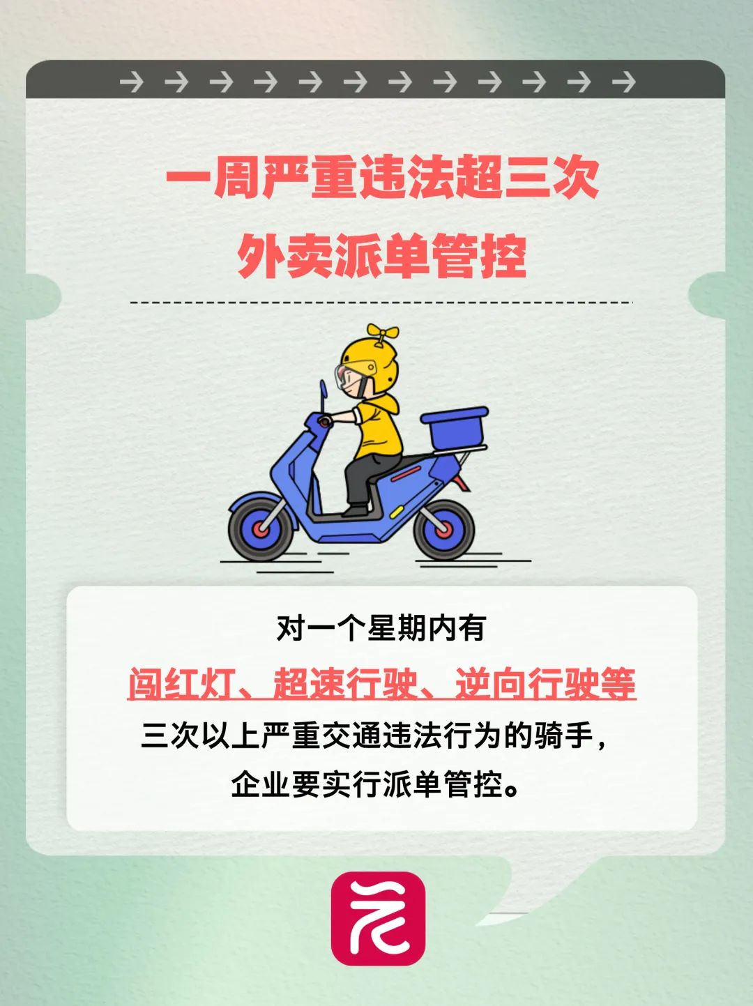 即时配送企业应当对一个星期内有三次以上闯红灯、超速行驶、逆向行驶等严重交通违法行为的驾驶人实行派单管控。