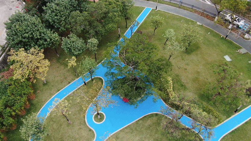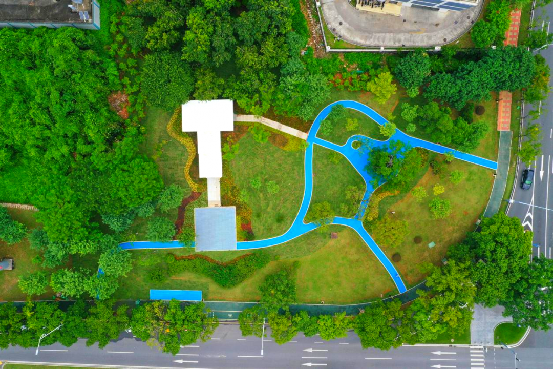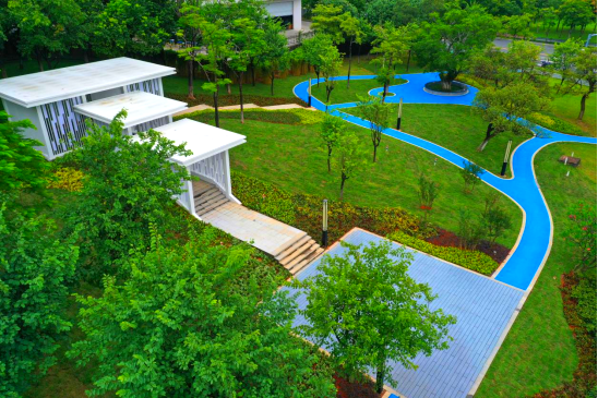 公园用“科技蓝”与“云朵白”为主要色调,设计园路与城市绿道有机连接,形成环形健康跑道;同时增设景观廊架、休闲平台坐凳,为居民提供休憩空间,满足群众日益增长的运动需求。