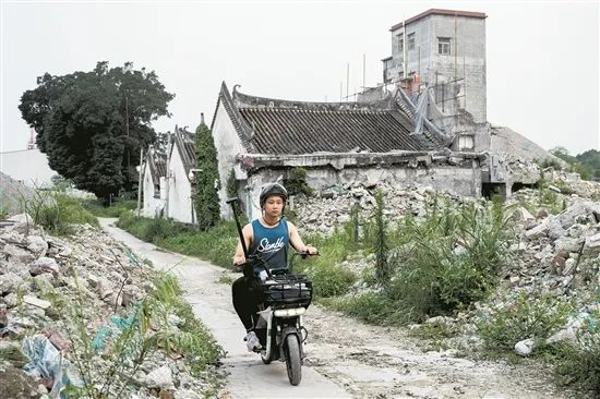 △来自珠江村的李子轩带着船桨骑车从龙船协会出发前往乌涌训练,身后是他以前的家园。珠江村改造计划启动,他们于2021年搬离。