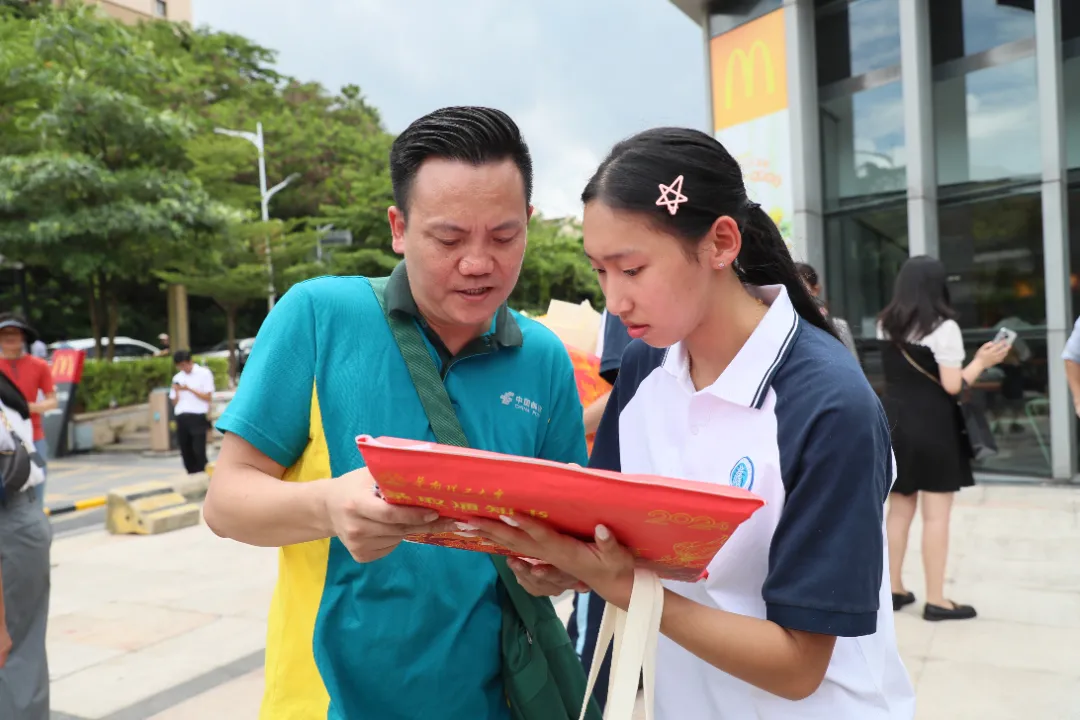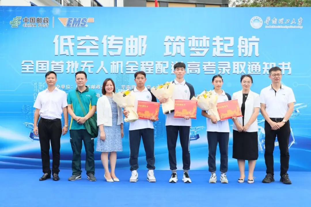随着无人机缓缓降落,考入华南理工大学的王韵怡、李金权、钟铭诚、涂苏蓝四名学子收到了期待已久的录取通知书。