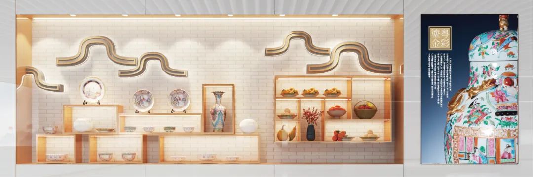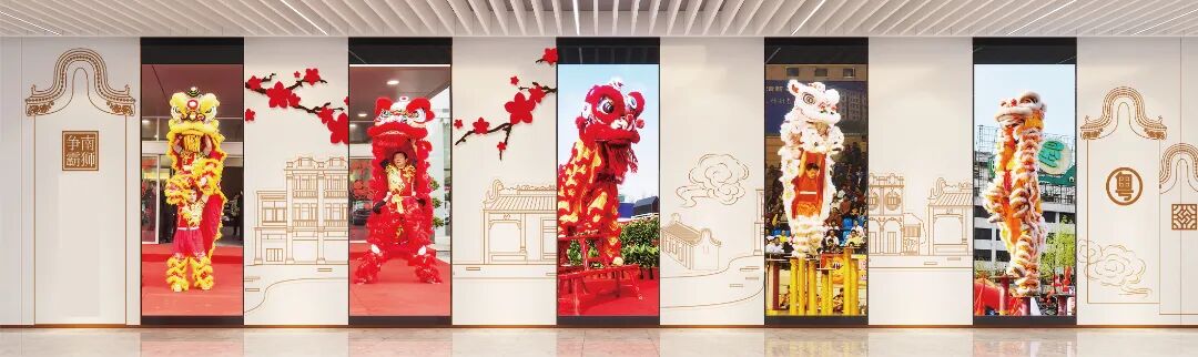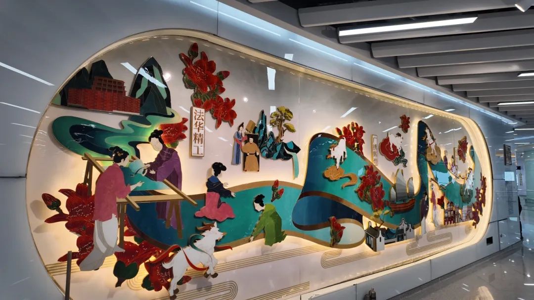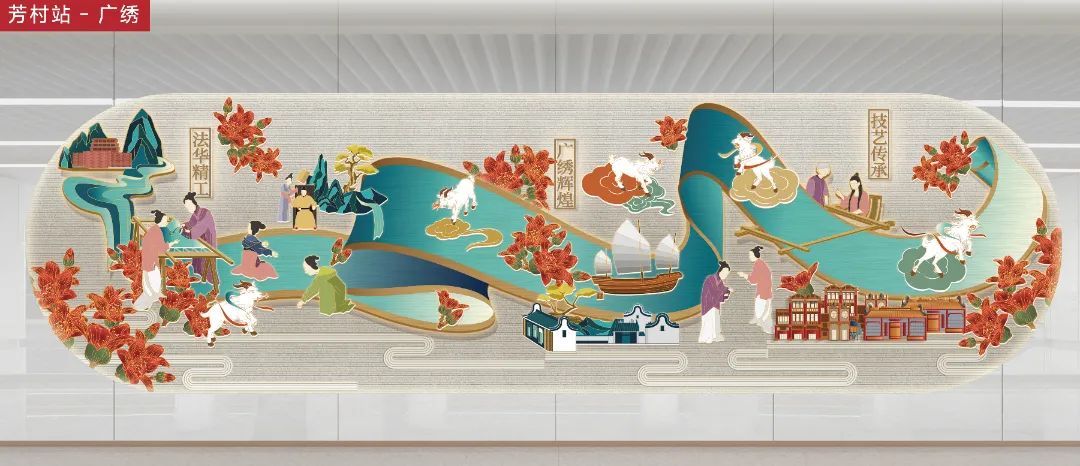 芳村站文化图腾采用了“五羊衔五穗”和“广雕窗花”作为主要元素。环视站厅,共设有两组文化展示橱窗和一组艺术品展示橱窗,出入口标识也同步植入了非遗元素,使整个车站的设计风格更统一,别具一番岭南韵味。