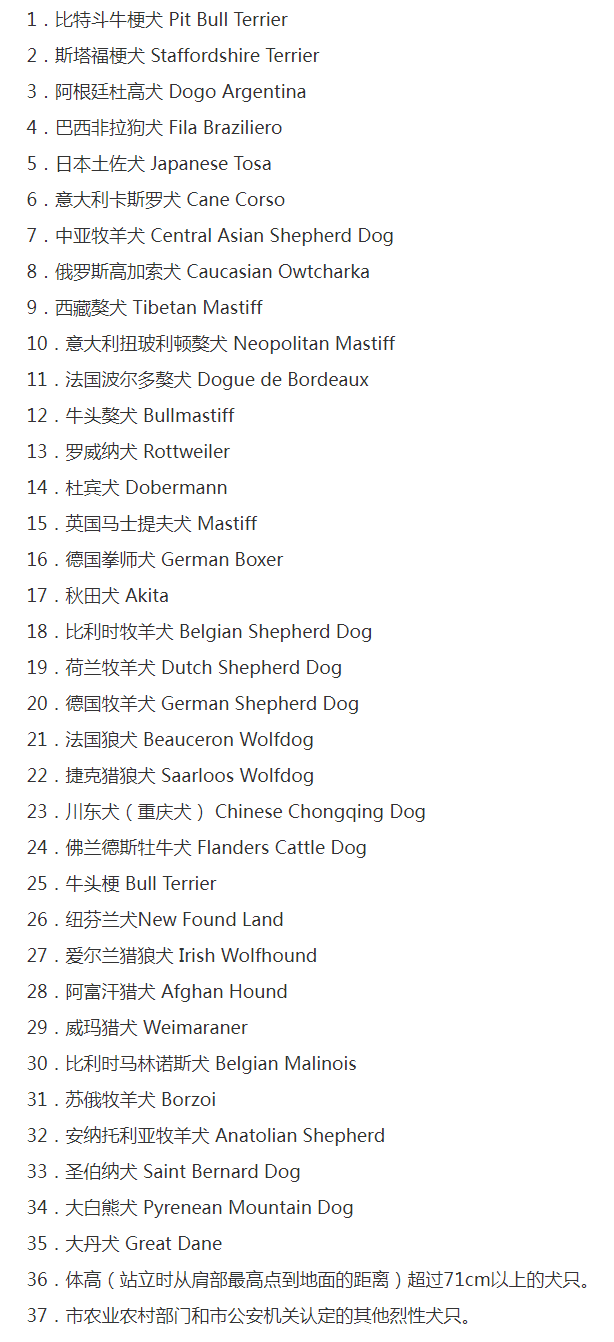 二、广州市一般管理区实行圈养和严格管理区禁止饲养、销售、繁殖的危险犬品种: